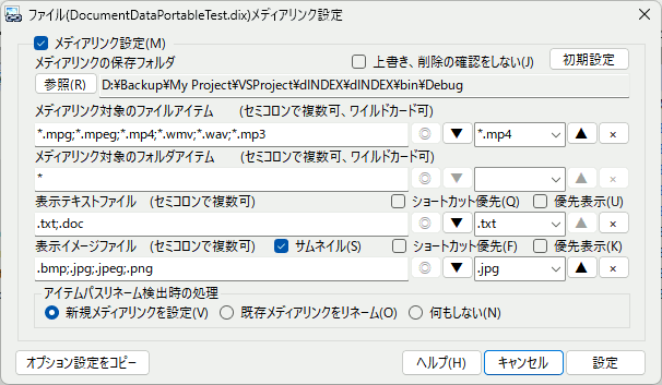 ※メディアリンク機能は、dINDEXがメディアリンクの保存フォルダ内のファイルの登録、削除処理を行うので、メディアリンクの保存フォルダは既存ファイルに影響を与えないフォルダを設定してください。